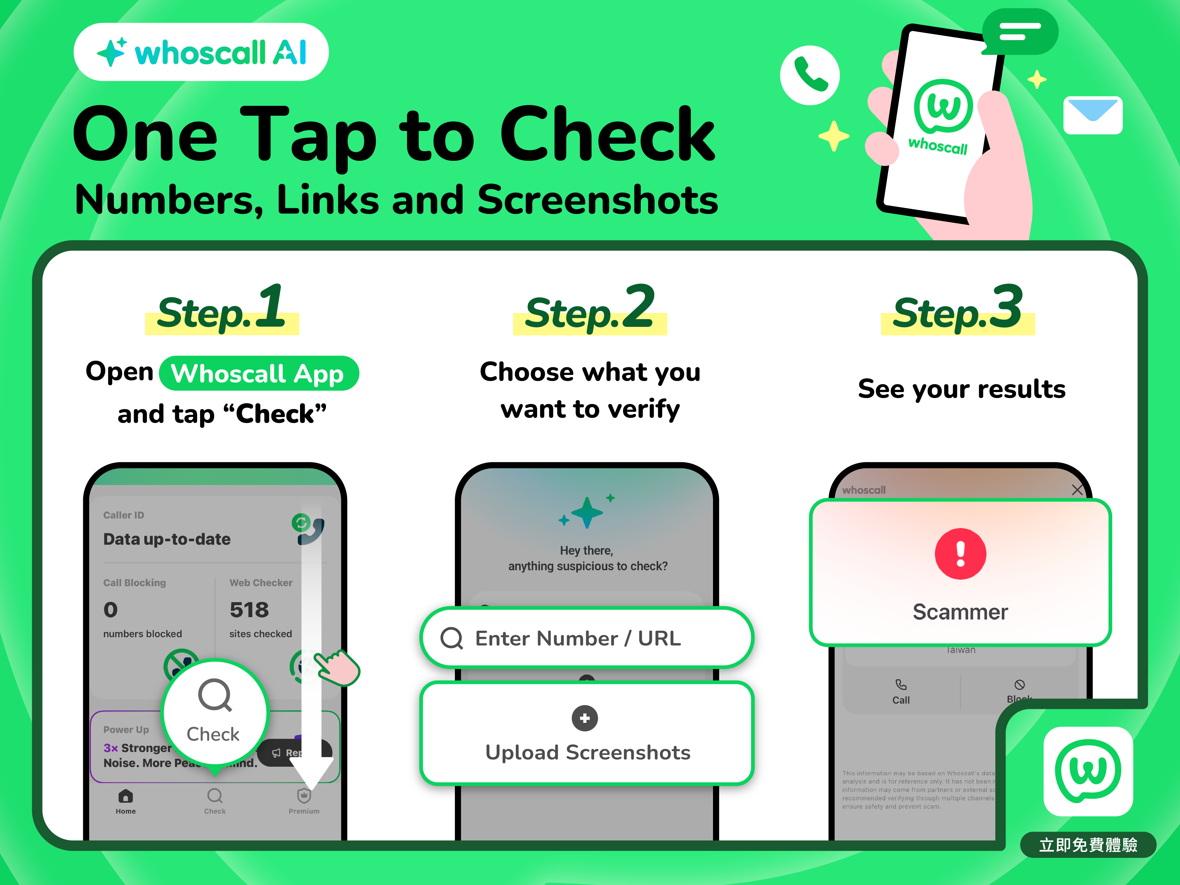 No more switching between tools. Check works in one smooth, intuitive flow—powered entirely by Whoscall AI.