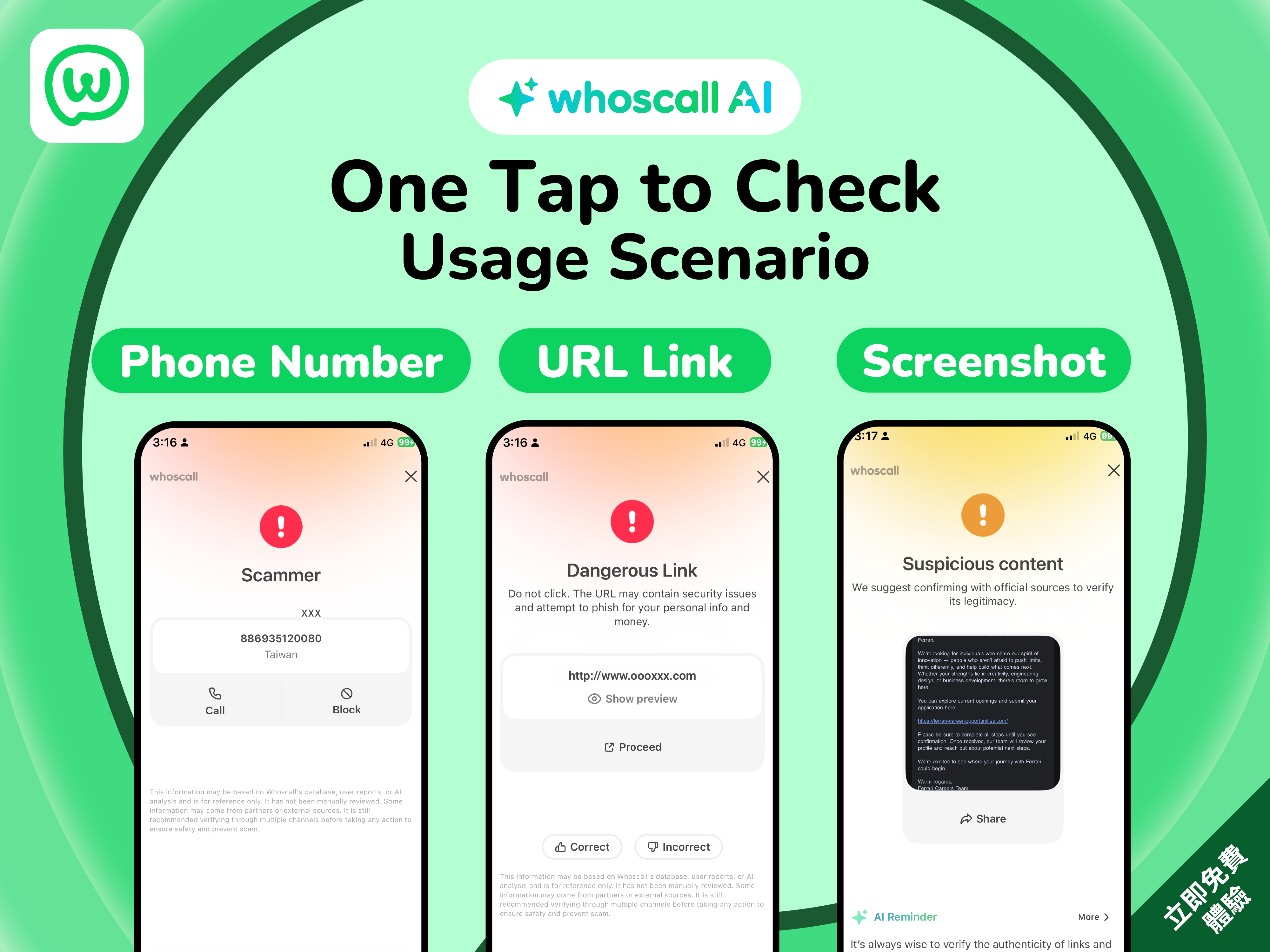 Content Checker: Upload a screenshot and let Whoscall AI flag anything suspicious