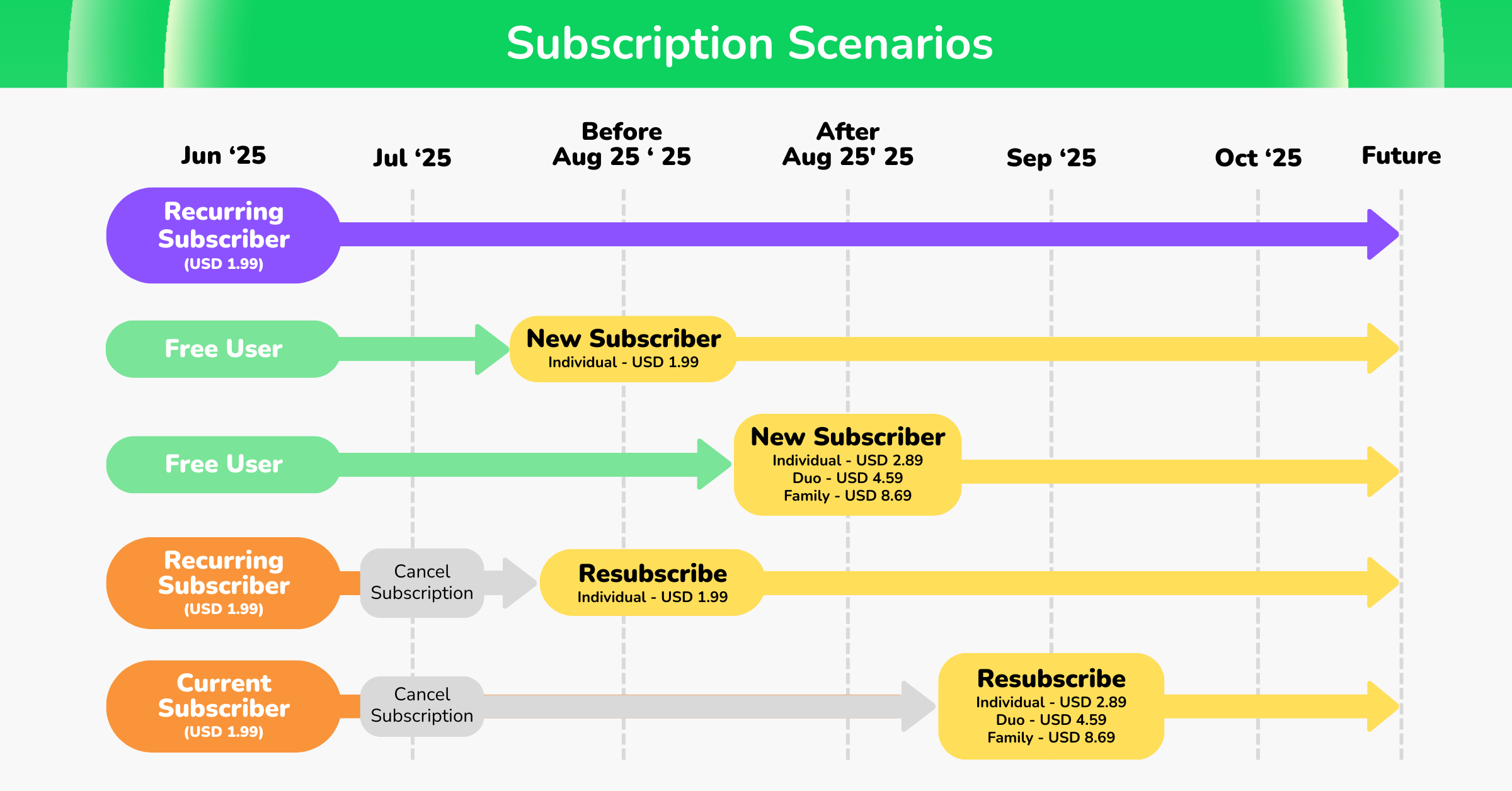USD 2.89/month, USD 27.00/year for every time a subscription is activated after Aug 25th). Here’s a chart to help you understand.