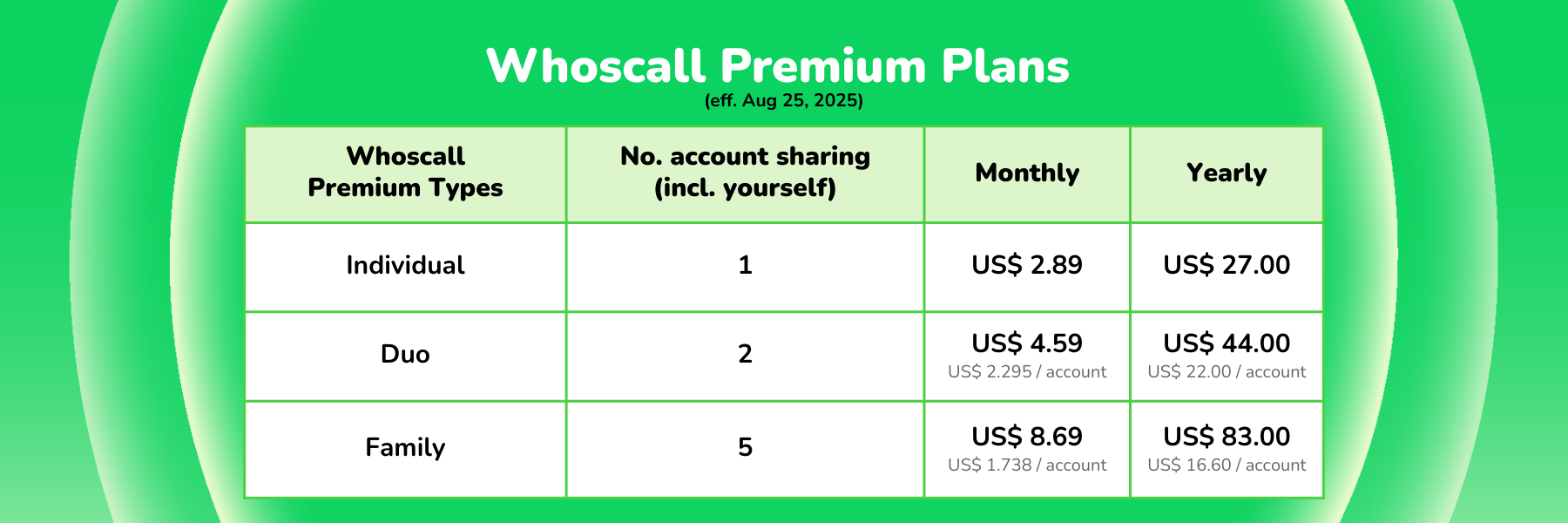 We are incredibly grateful for your continued trust and support. As a current Whoscall Premium subscriber, your price will not be affected by this adjustment. You will continue to pay the same rate you are currently paying which will enable you to stay protected from the rising trend of scams.