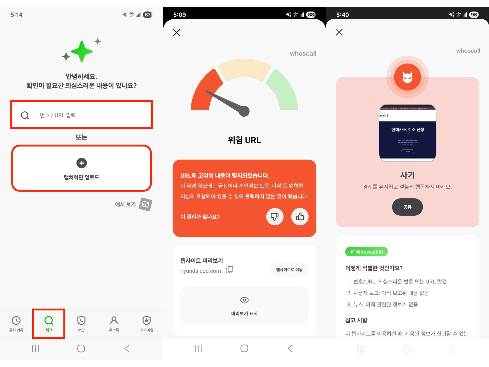 - 후스콜 체크 : 의심가는 URL 링크, 전화 번호, 스크린샷까지 후스콜 체크로 사기 여부 한 번에 확인!