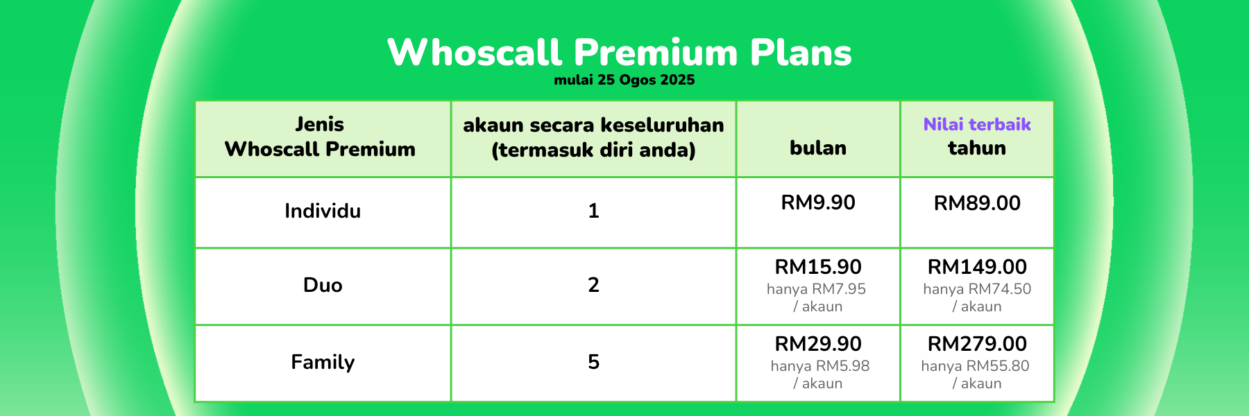 - Perlindungan tambahan Whoscall Premium dan boleh dikongsi dengan empat orang lain dalam kalangan anda (5 akaun secara keseluruhan).