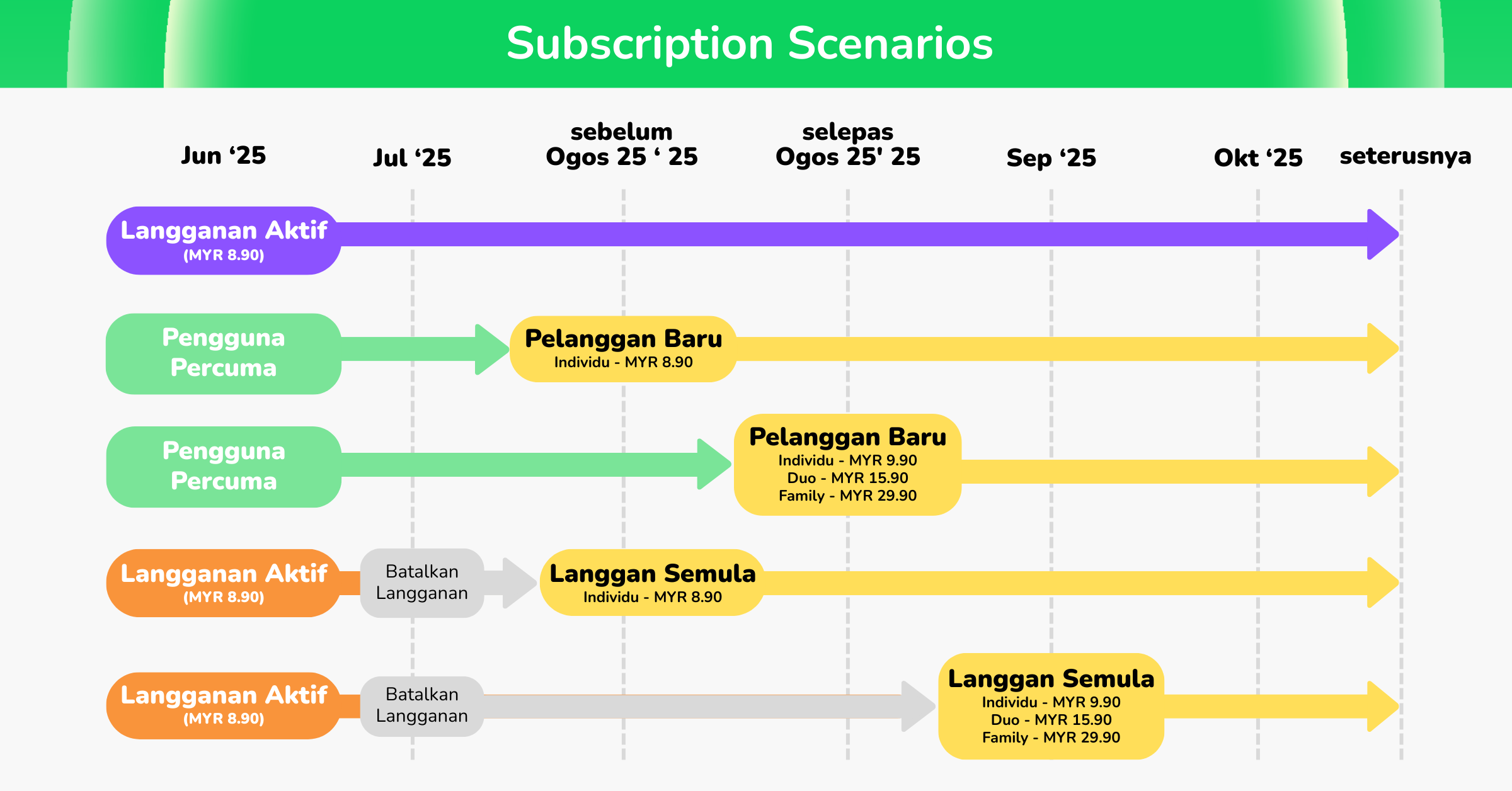 - RM9.90/bulan, RM89.00/tahun (setiap kali langganan diaktifkan selepas 25 Ogos).