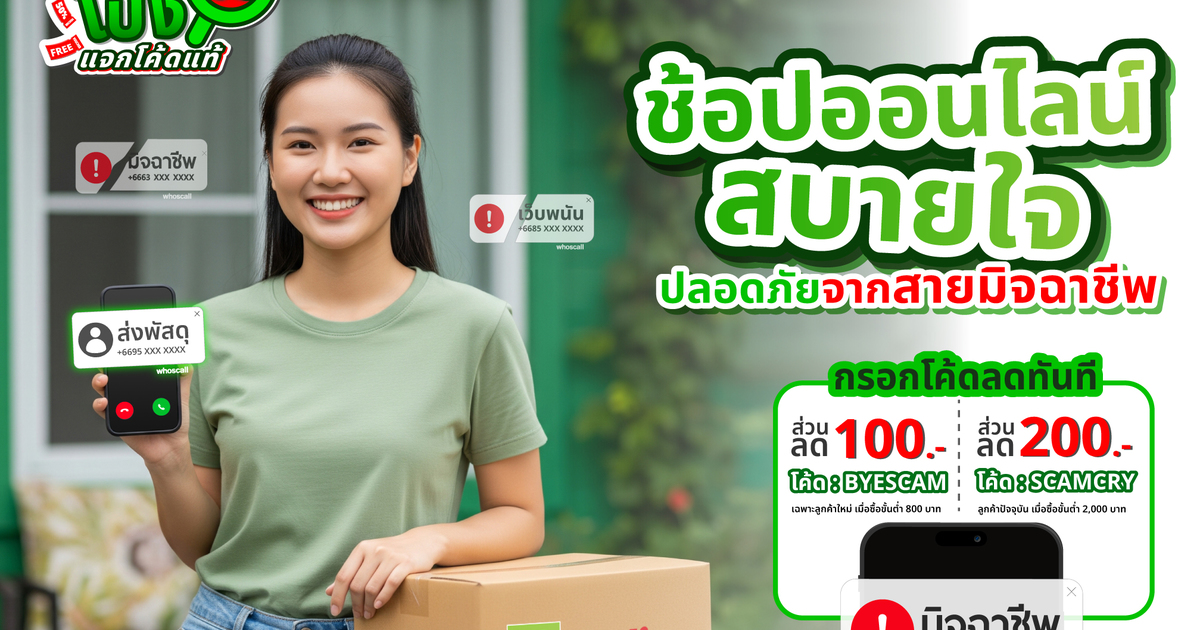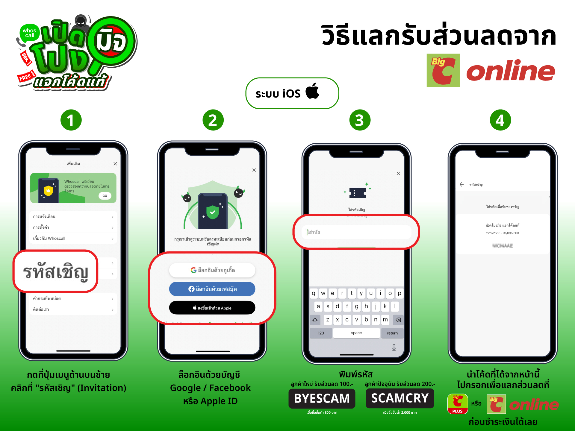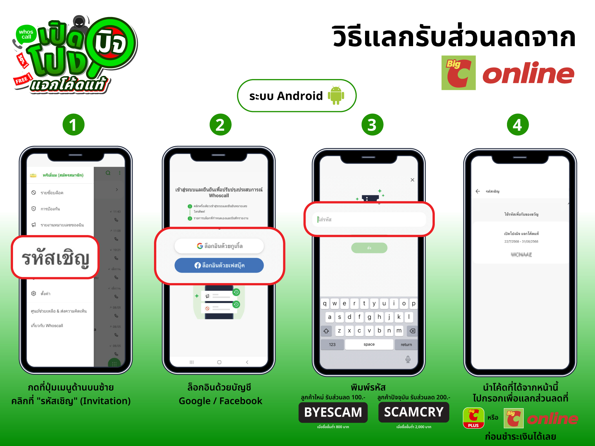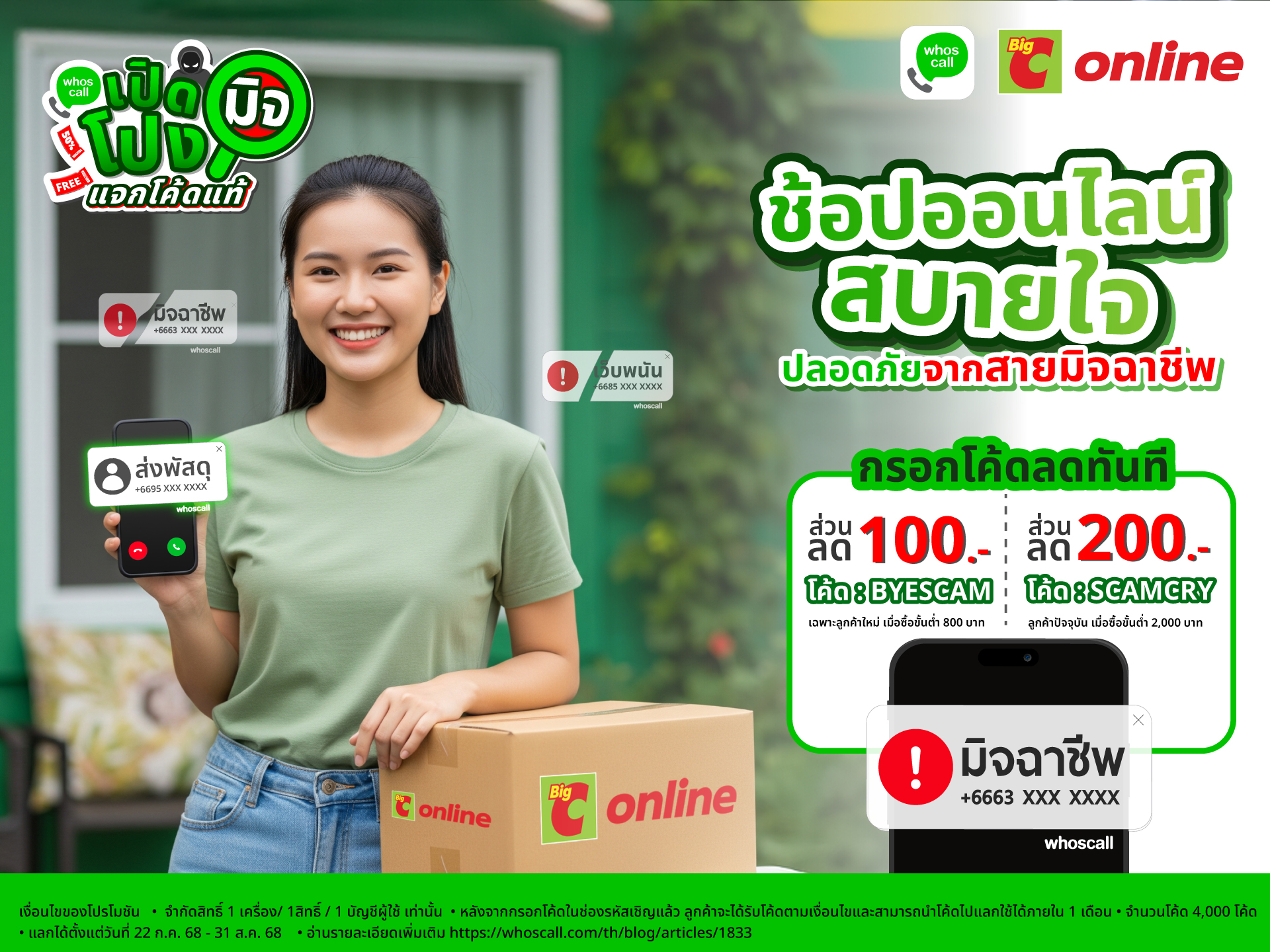 นอกจากจะช่วยให้คุณปลอดภัยจากเบอร์ต้องสงสัย Whoscall ยังมาพร้อมกับแคมเปญสุดคุ้ม “เปิดโปงมิจ แจกโค้ดแท้” ที่ให้คุณได้ทั้ง ความอุ่นใจในการใช้งานโทรศัพท์ และ ส่วนลดแท้ๆ จาก Big C Online