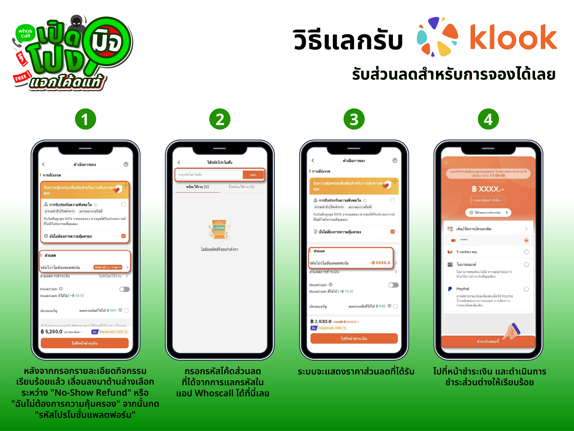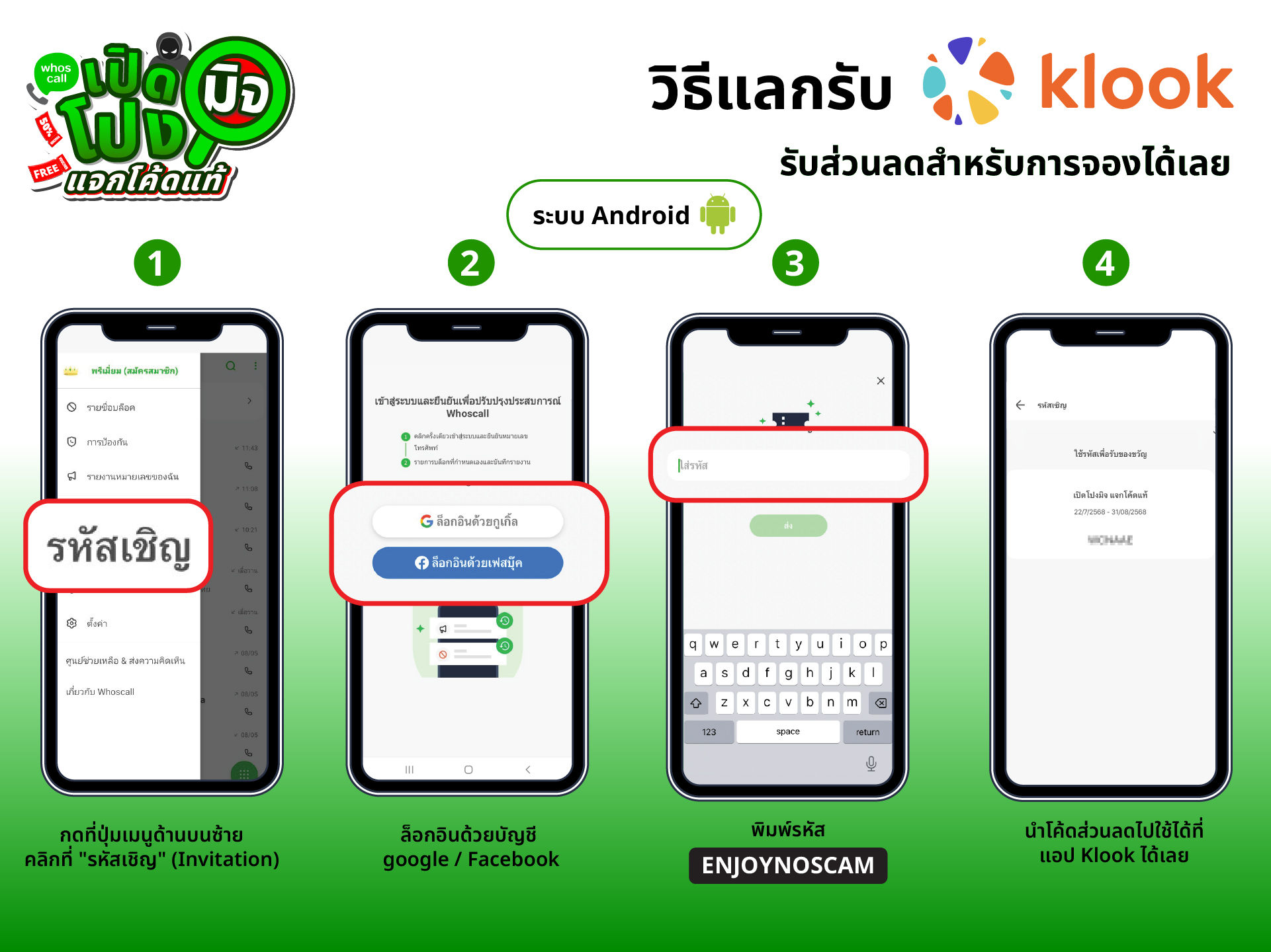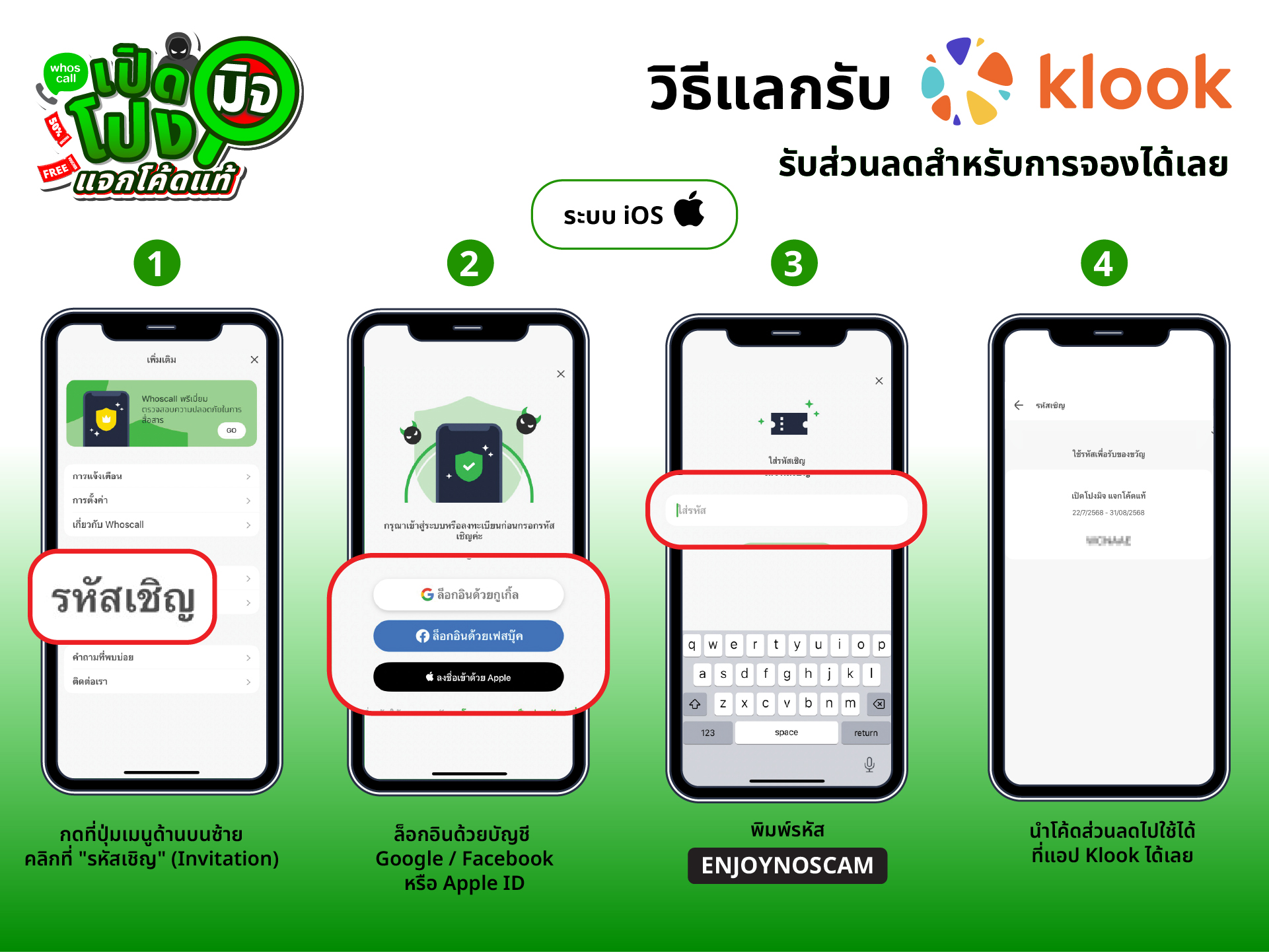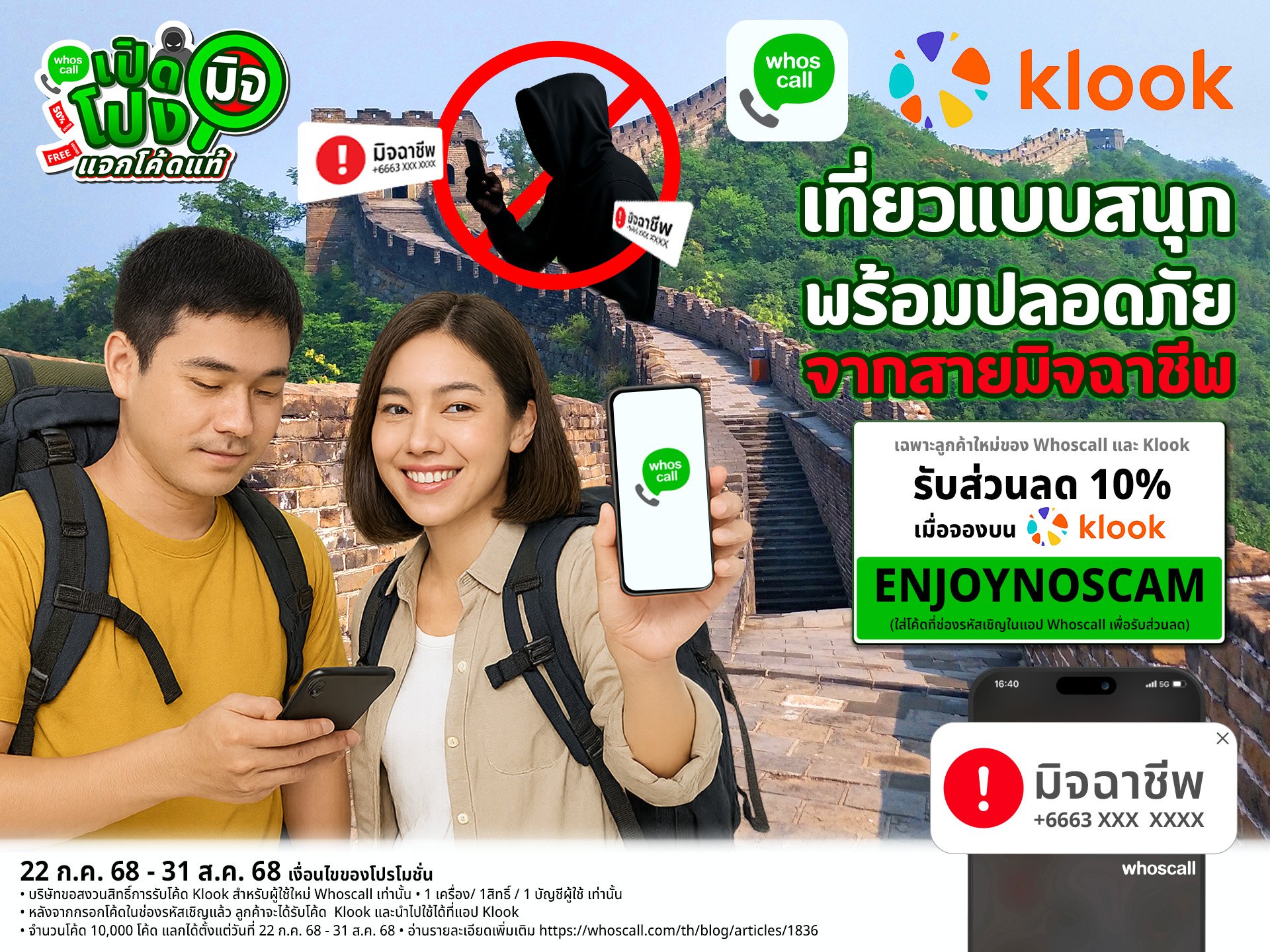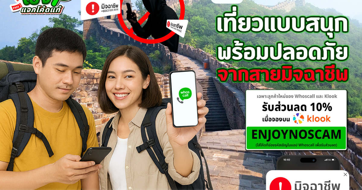 ในแคมเปญ “เปิดโปงมิจ แจกโค้ดแท้” Whoscall จับมือกับ Klook แจกโค้ดแท้สุดคุ้ม! เพียงดาวน์โหลดแอป Whoscall และกรอกรหัสเชิญที่ได้รับ ก็สามารถรับโค้ดส่วนลดจาก Klook ไปใช้ได้ทันที ไม่ว่าจะจองบัตรเที่ยวสวนสนุก ทัวร์กิจกรรมในเมืองต่างประเทศ หรือแม้แต่การเดินทางในประเทศ ก็ประหยัดได้แบบมั่นใจ