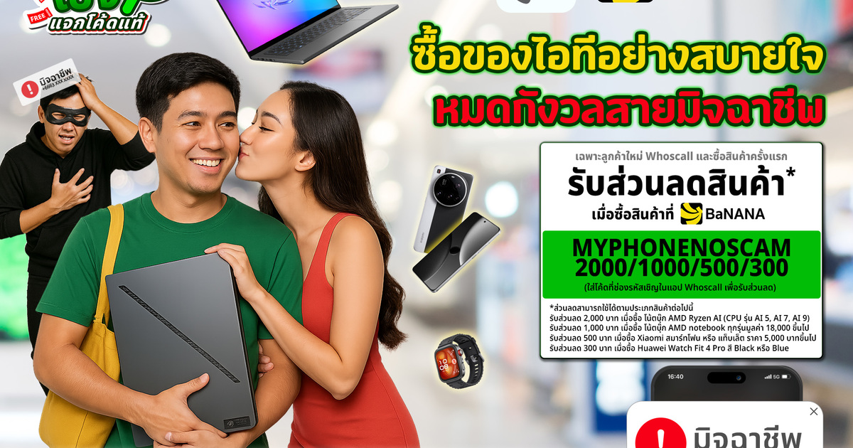 แค่ดาวน์โหลดแอป Whoscall แล้วกรอกรหัสเชิญจากแคมเปญ คุณก็มีสิทธิ์รับโค้ดส่วนลดของแท้ จาก BaNANA ใช้ซื้อแกดเจ็ต โน้ตบุ๊ก สมาร์ตโฟน อุปกรณ์เสริม และสินค้าไอทีอีกมากมาย ในราคาสุดคุ้ม!