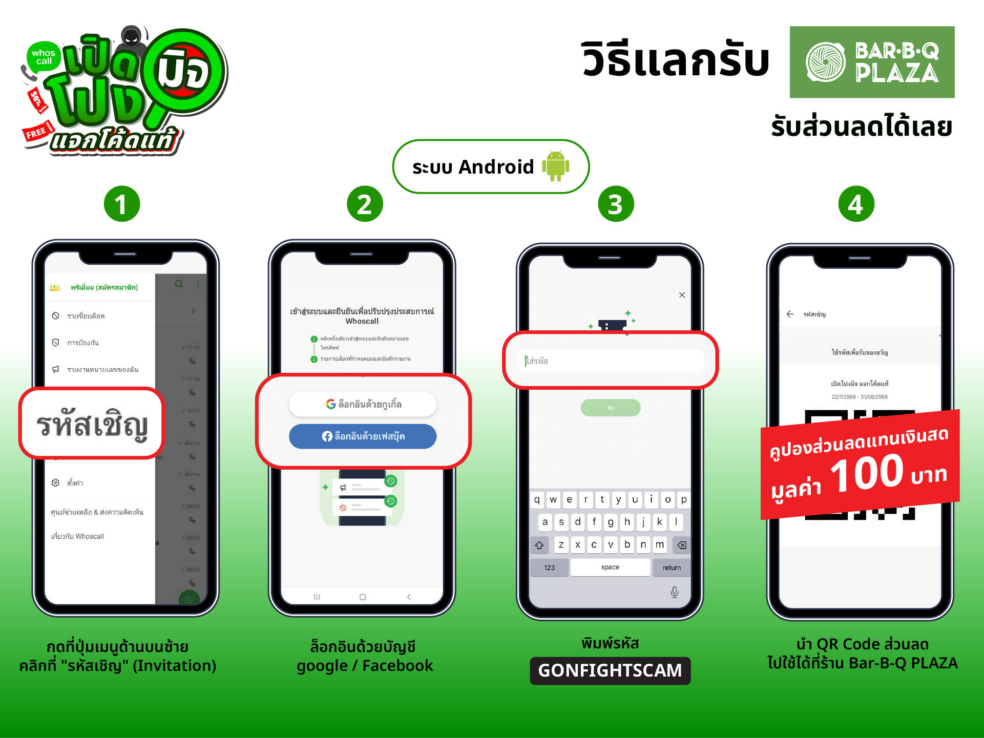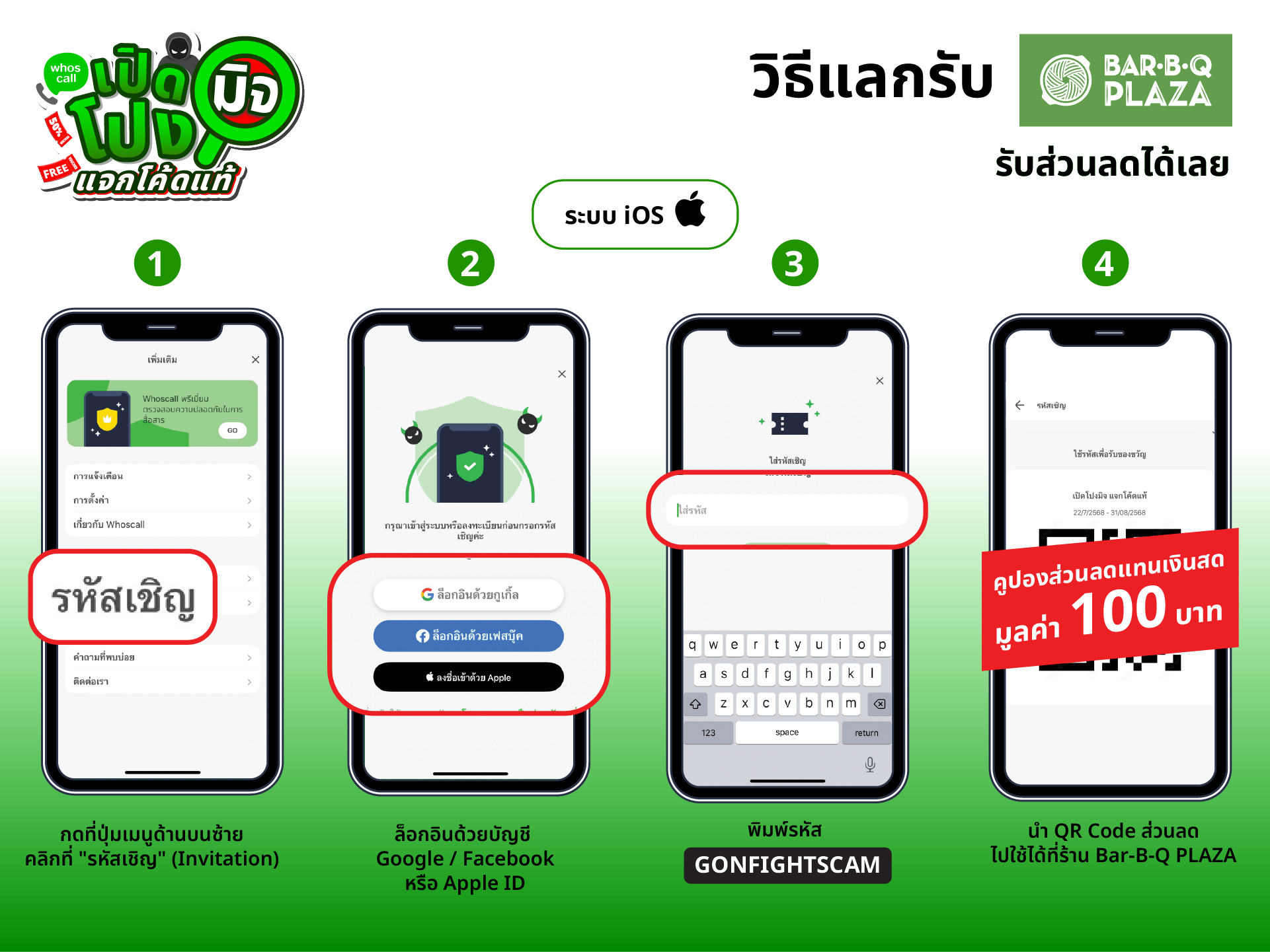 แค่ ดาวน์โหลดแอป Whoscall นำโค้ดไปกรอกที่ช่องรหัสเชิญ รับโค้ดจาก Bar-B-Q Plaza โดยไม่ต้องกลัวโดนหลอก ไม่ต้องลุ้นว่าโค้ดใช้ได้ไหมเพราะนี่คือโค้ดแท้! เพิ่มความคุ้มค่าให้มื้อปิ้งย่างของคุณ และปลอดภัยจากมิจฉาชีพที่แฝงมาในโลกออนไลน์