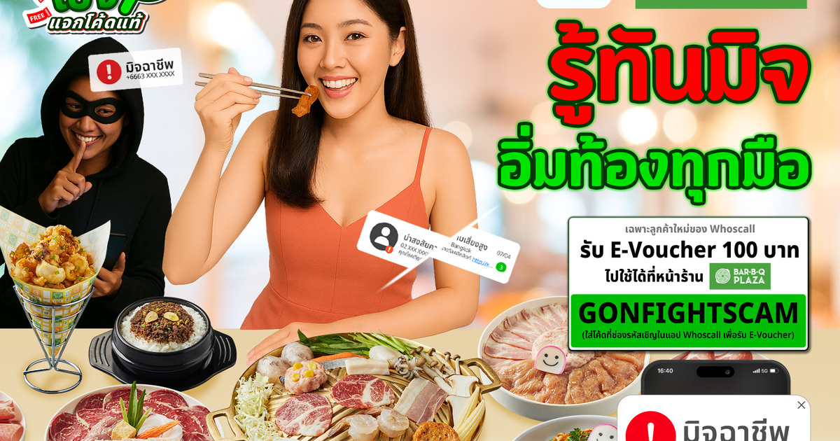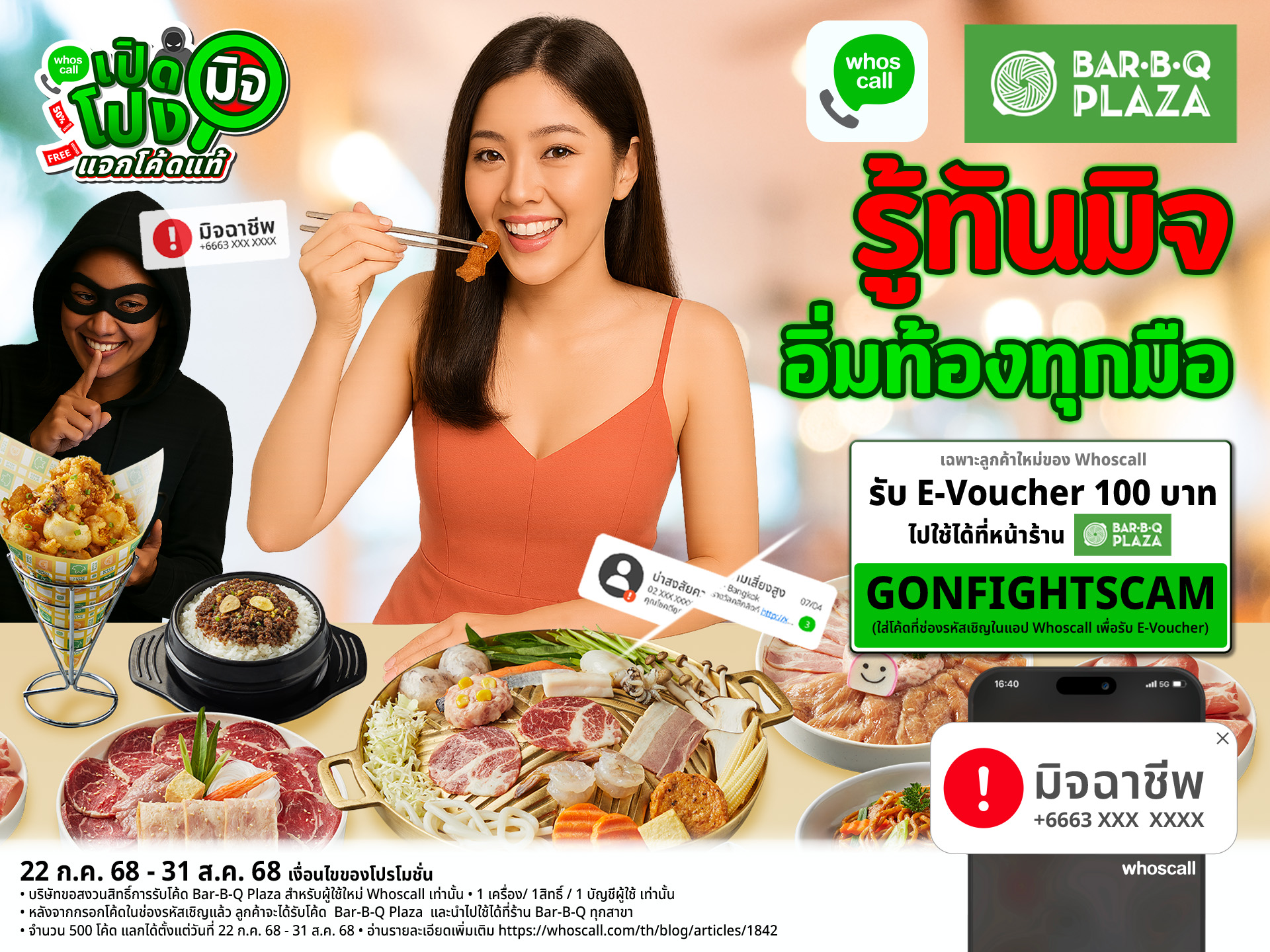 เพื่อให้คุณอุ่นใจทุกสายที่โทรเข้า และไม่พลาดโค้ดแท้จากแบรนด์ดัง Whoscall ขอร่วมมือกับ Bar-B-Q Plaza ในแคมเปญ “เปิดโปงมิจ แจกโค้ดแท้”