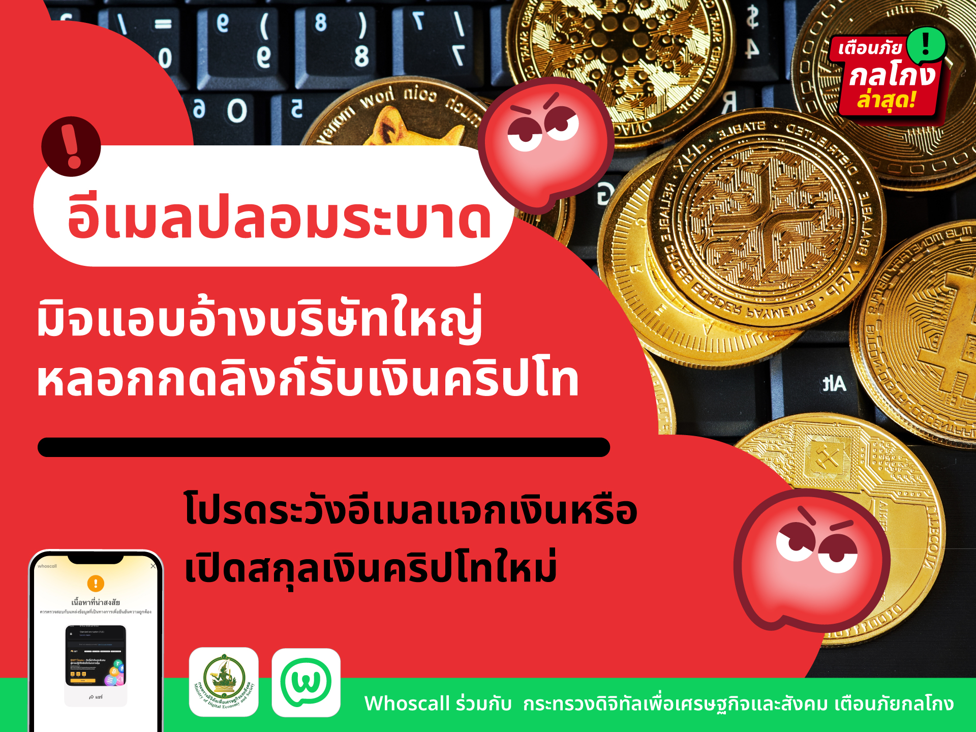 กระทรวงดีอีเตือนภัยด่วนกรณี มีอีเมลปลอมจากมิจฉาชีพหลอกกดลิงก์รับสิทธิ์เงินคริปโท ใช้มุกแอบอ้างบริษัทชื่อดังต่าง ๆ ทั้งหลอกว่ามีการเปิดตัวสกุลเงินดิจิทัลใหม่ หรือ หลอกว่ามีการแจกเงินคริปโท ขอให้ทุกคนโปรดระวัง อย่าหลงเชื่อ อย่ากดลิงก์ โดยมีหลากหลายบริษัทโดนแอบอ้างแล้ว เช่น