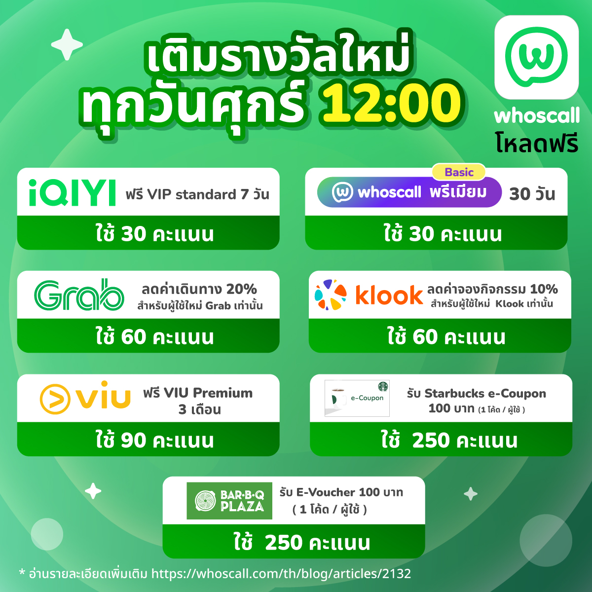 *สามารถอ่านรายละเอียดข้อกำหนดและเงื่อนไขของรางวัลแต่ละรางวัลได้ขณะแลกรับของรางวัลในแอป Whoscall