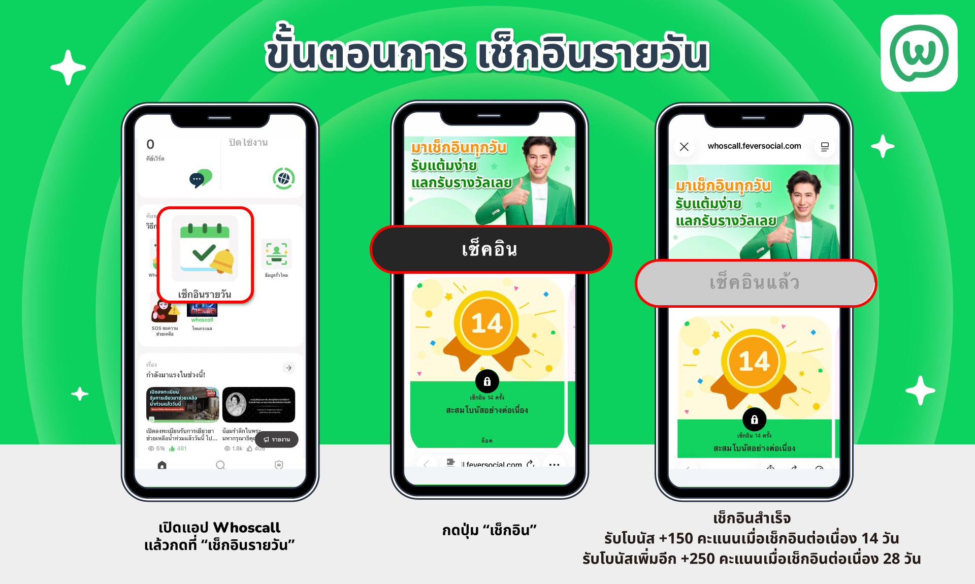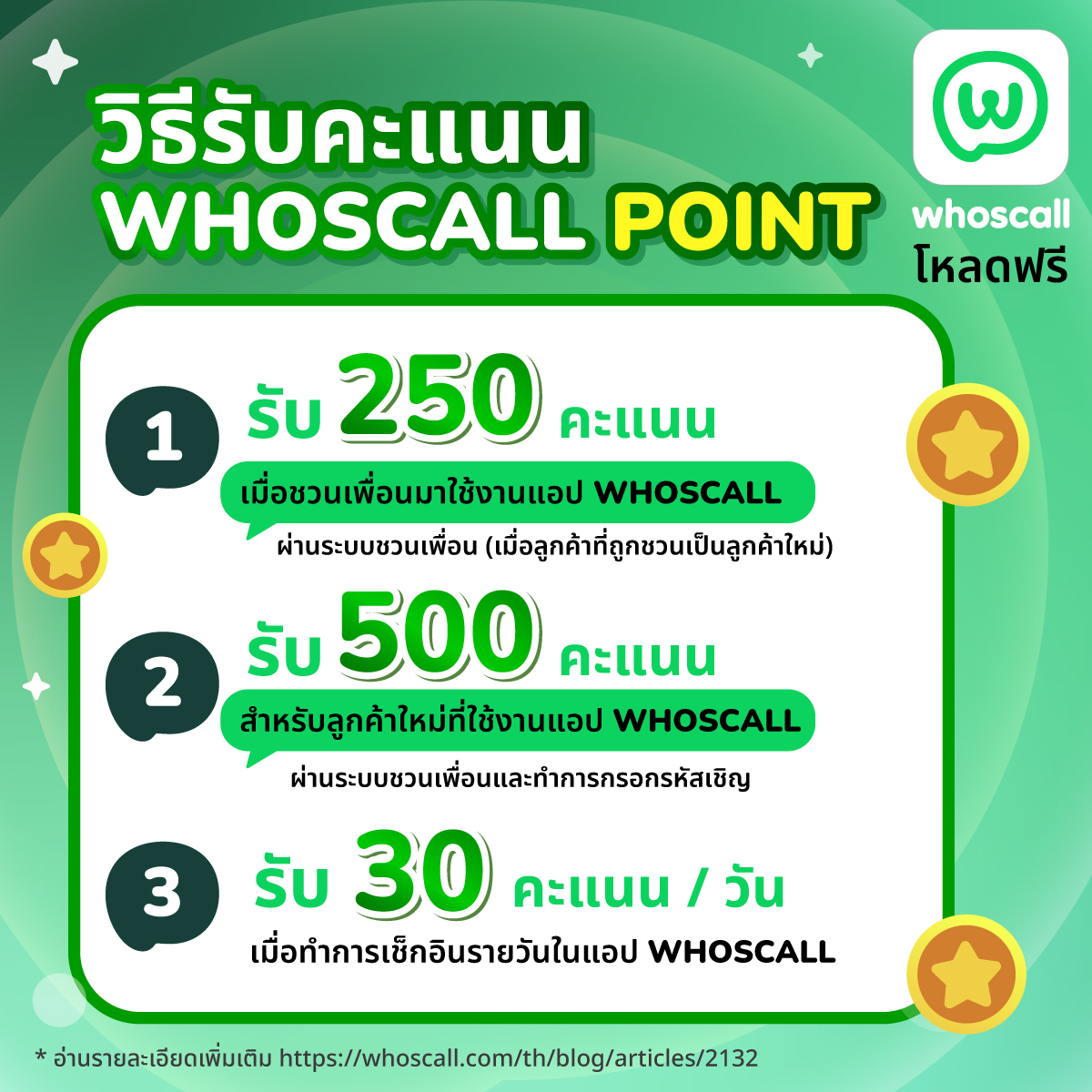 - รับ Whoscall Point 30 คะแนนทุกวัน เมื่อทำการเช็กอินรายวันในแอป Whoscall