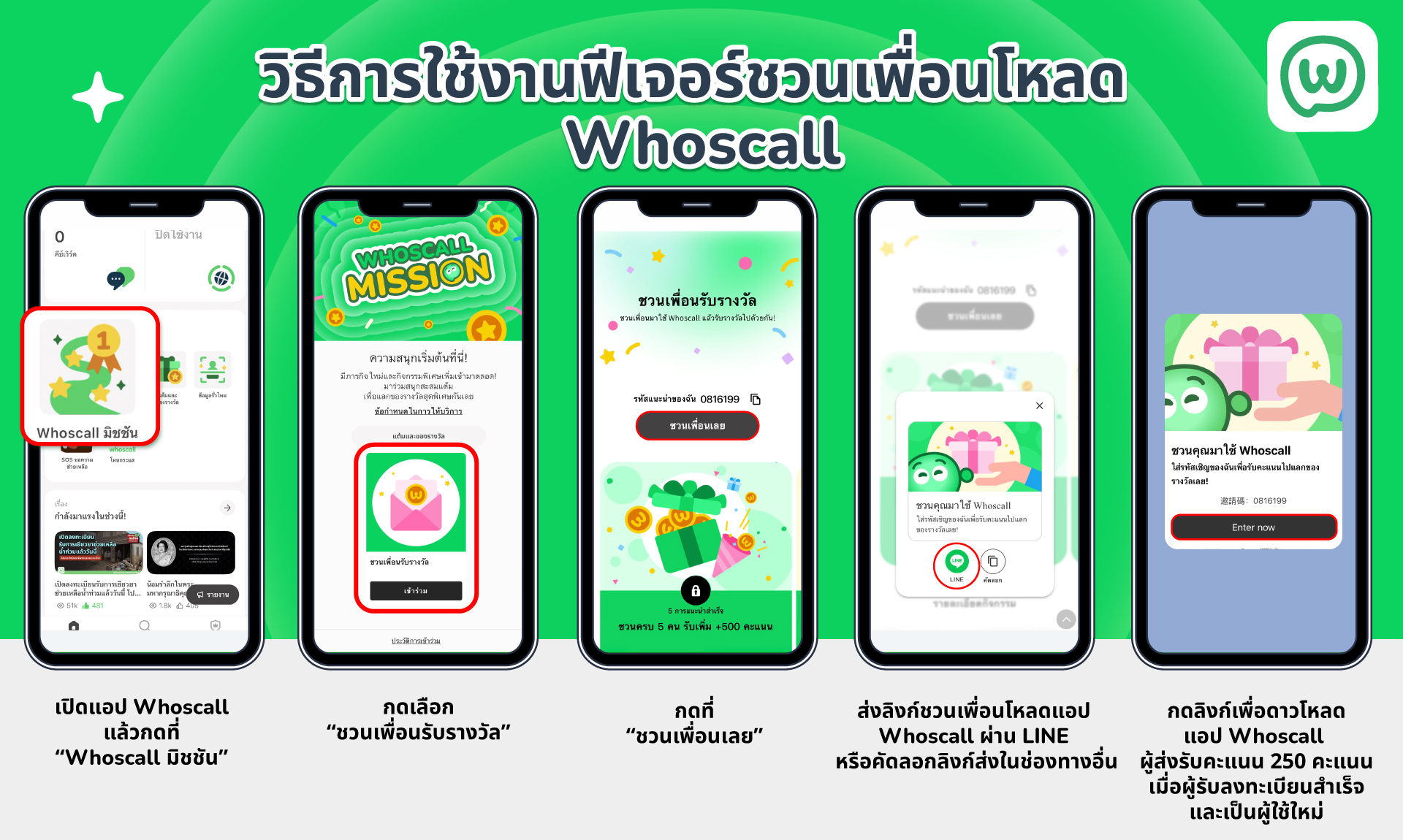 - รับ Whoscall Point 250 คะแนน เมื่อชวนเพื่อนโหลดแอป Whoscall ผ่านระบบชวนเพื่อนภายในแอป (ผู้ที่ถูกชวนจะต้องเป็นผู้ใช้ใหม่ผ่านรหัสเชิญ)