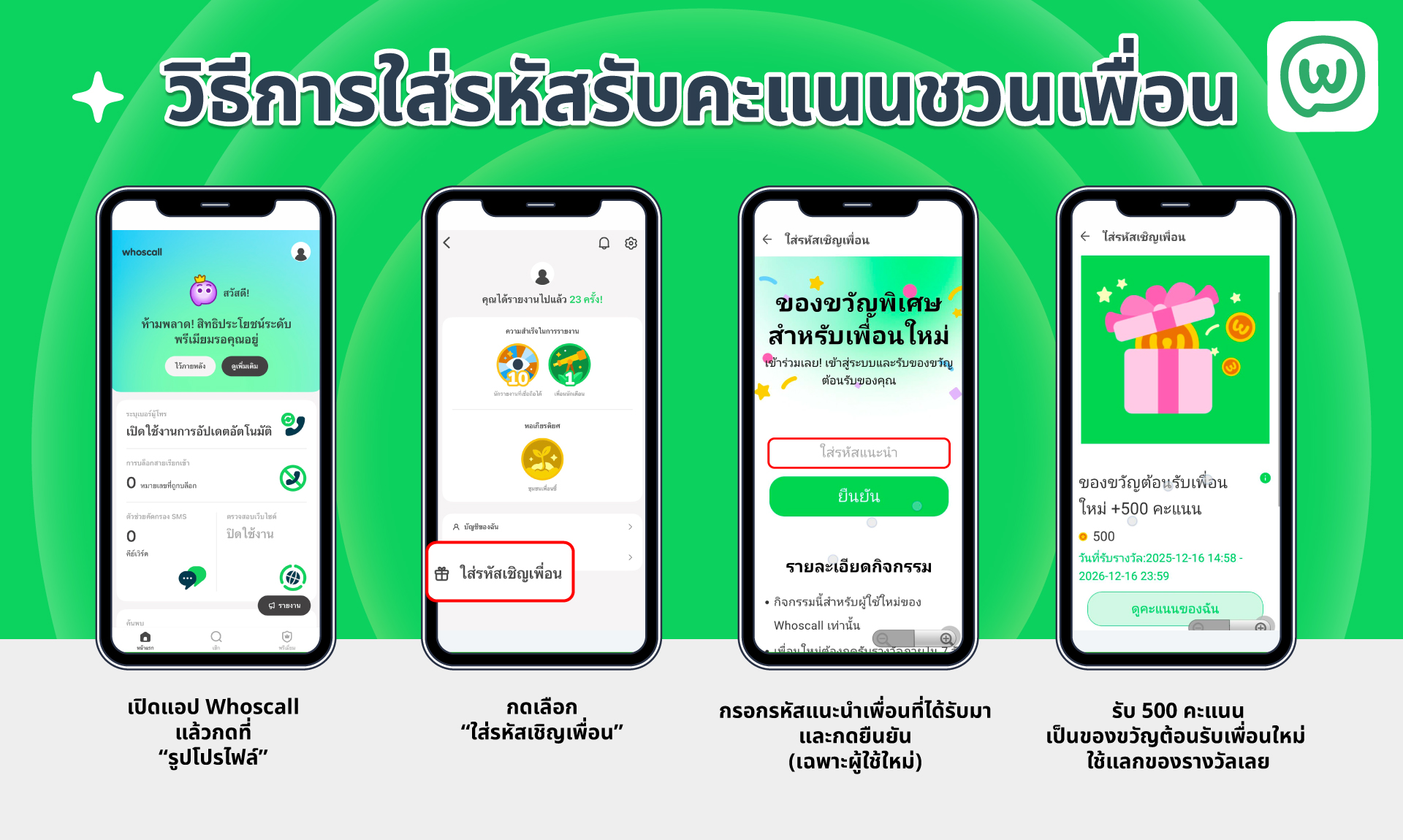 - รับ Whoscall Point 500 คะแนน สำหรับผู้ใช้ใหม่ที่โหลดแอป Whoscal และกรอกรหัสเชิญจากระบบชวนเพื่อน