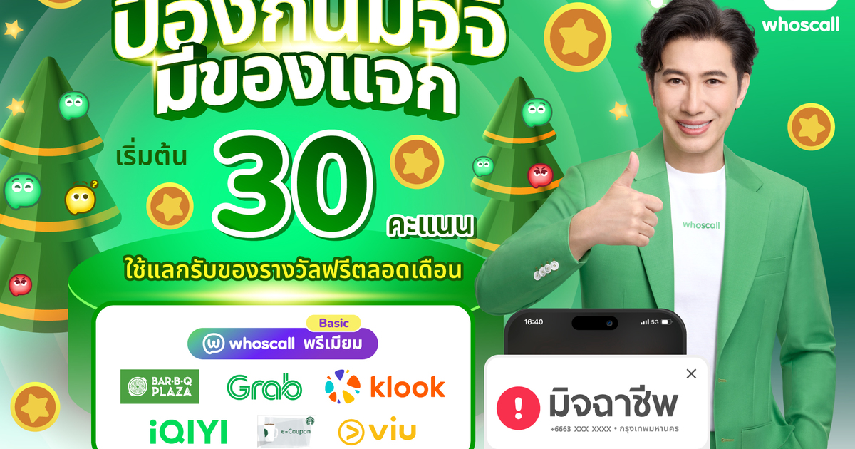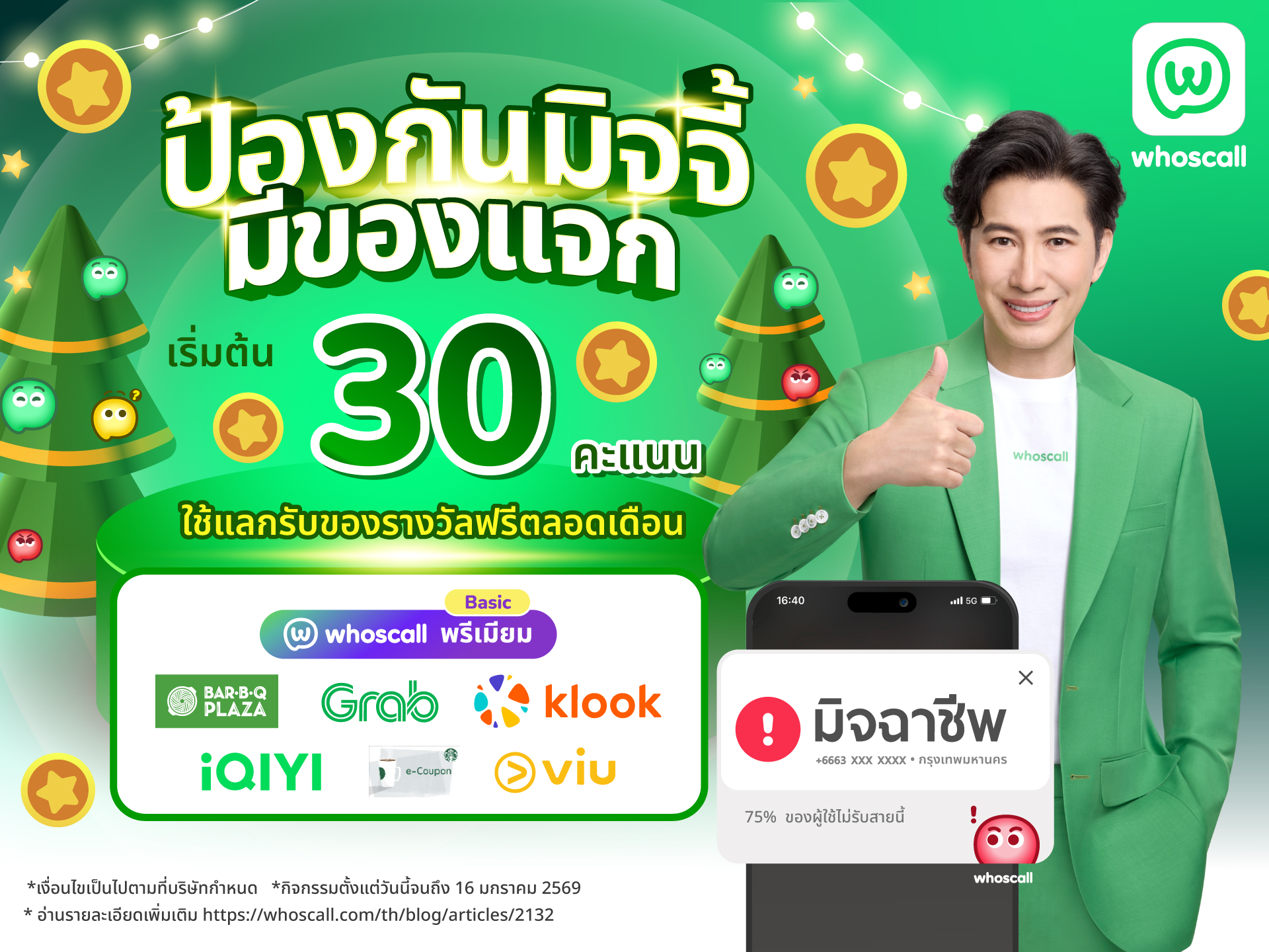 Whoscall ขอต้อนรับเทศกาลวันหยุดส่งท้ายปี ให้ปีใหม่นี้ไม่มีมิจมากวนใจ พร้อมรับของรางวัลมากมาย แค่เปิดแอป Whoscall แล้วเก็บ Whoscall Point มาแลกของรางวัลทุกวันศุกร์ ตั้งแต่วันนี้จนถึง 16 มกราคม 2569