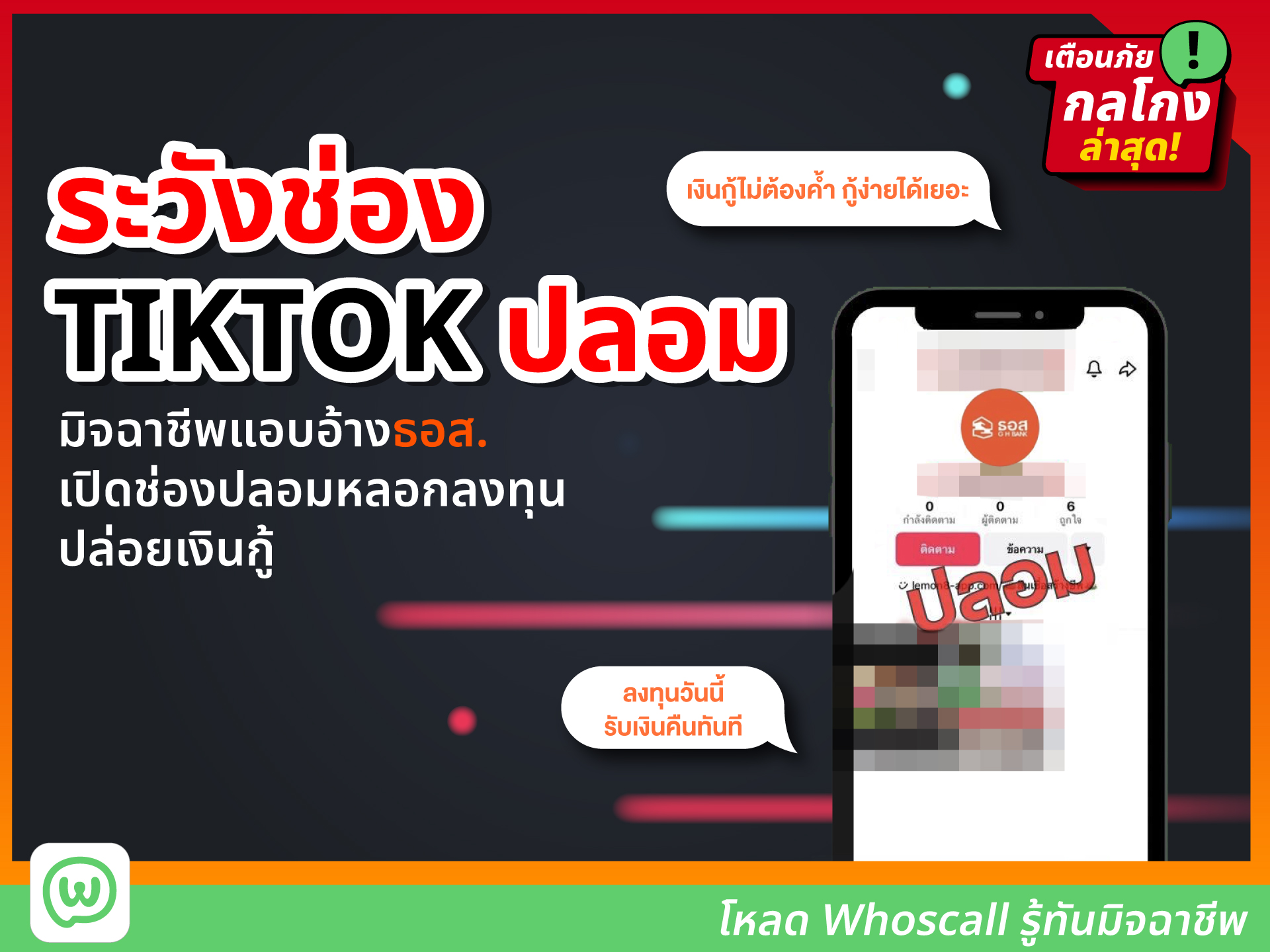 ระวังช่อง TIKTOK ปลอมแอบอ้างเป็นธอส. หลอกปล่อยเงินกู้ หลอกลงทุน