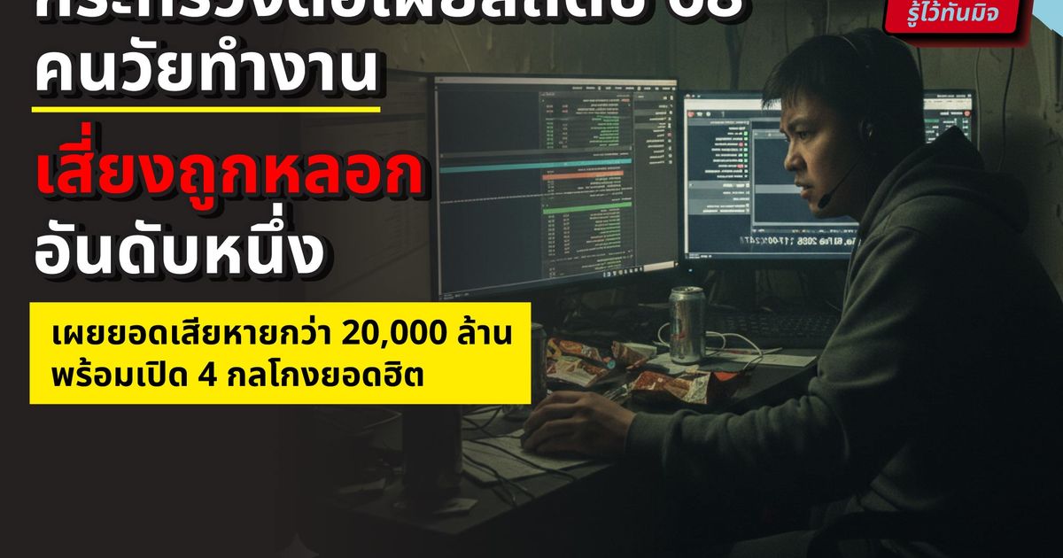 จากข้อมูลของศูนย์ AOC 1441 พบว่า สถิติในปี 2568 ที่ผ่านมาเผยให้เห็นข้อมูลที่น่าวิตกกังวลคือกลุ่มอายุ 20-49 ปี ซึ่งเป็นวัยทำงานและมีกำลังซื้อสูง กลับกลายเป็นกลุ่มที่มีความเสี่ยงสูงสุดในการตกเป็นเหยื่อของอาชญากรรมออนไลน์ ด้วยจำนวนผู้เสียหายมากถึง 405,929 เคส และความเสียหายทางการเงินสูงถึง 23,403 ล้านบาท