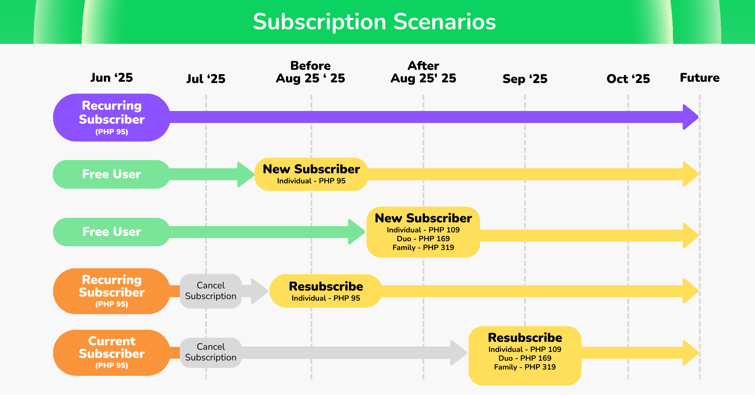 - PHP 109/month, PHP 990/year for every time a subscription is activated after Aug 25th. Here’s a chart to help you understand.