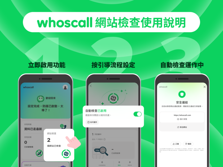 想要隨心所欲開啟網站又怕被騙嗎?趕快開啟 Whoscall 自動網站檢查,是不是有危險我們幫你檢查~