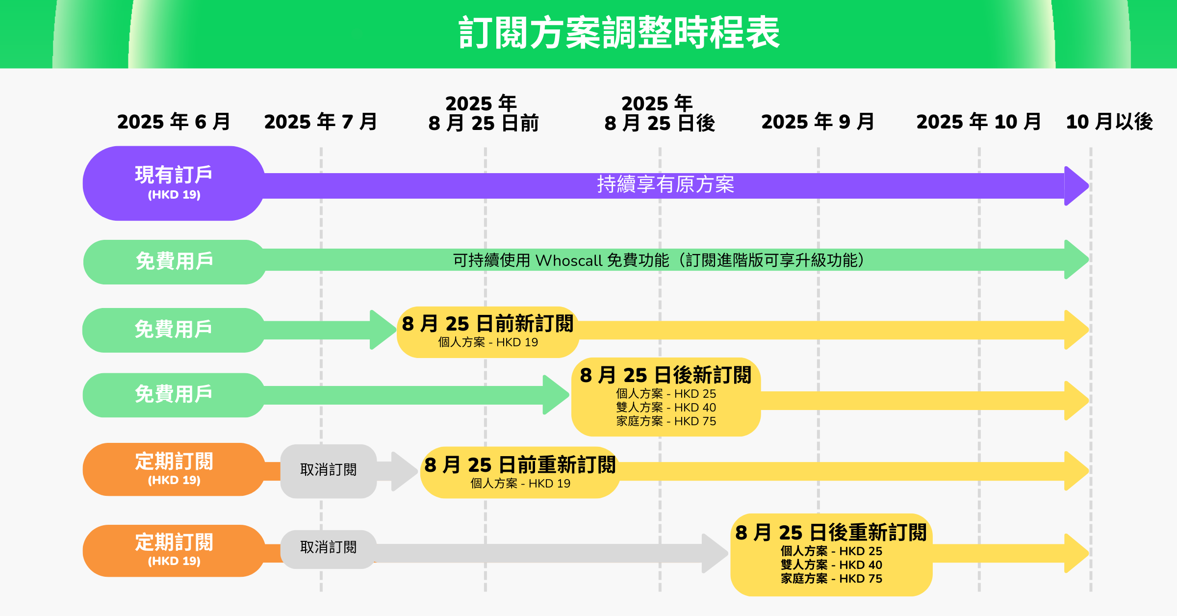 關於 Whoscall 進階版新訂閱方案即將喺 8 月 25 日生效嘅價格調整,我哋好開心可以同大家分享一個超級棒嘅好消息!