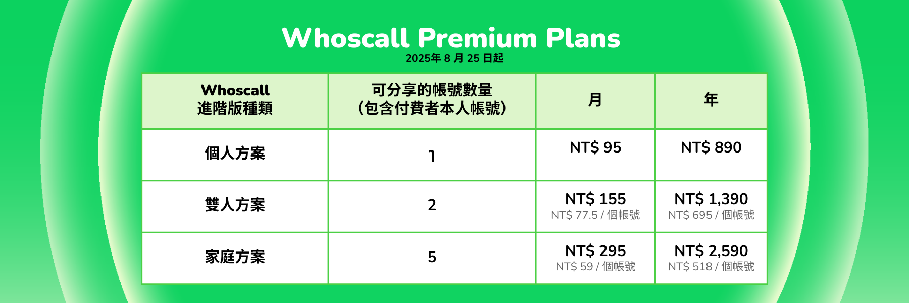 若要訂閱 Whoscall 進階版 雙人方案或家庭方案,請將 Whoscall 應用程式更新至最新版本(iOS 版本 4.0.1 以上 / Android 版本 8.0 以上)。