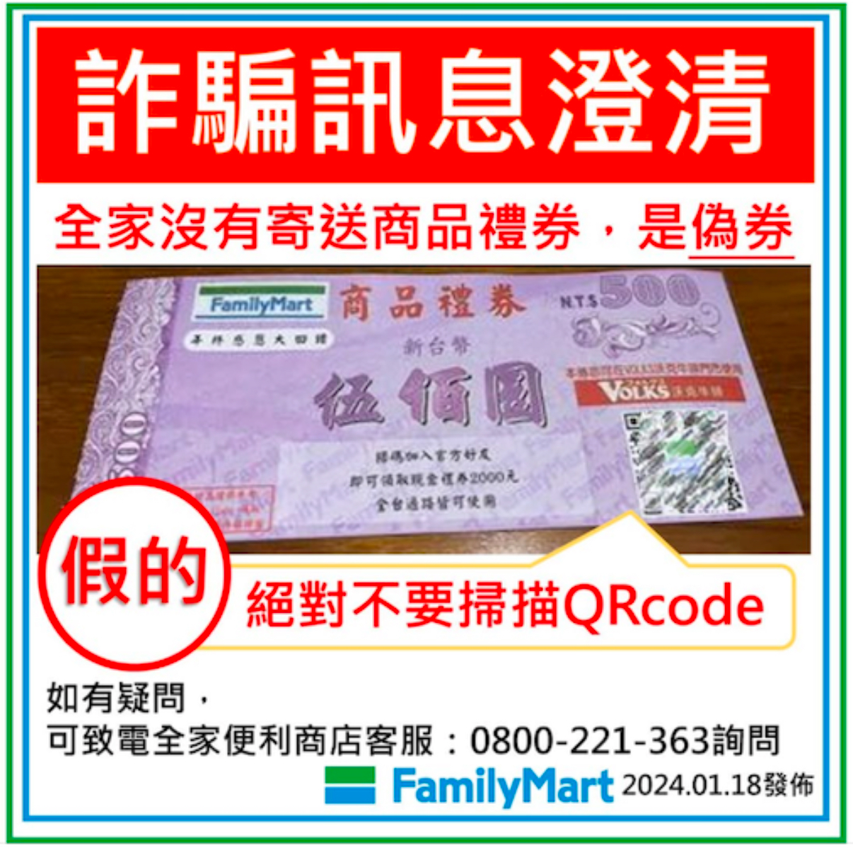 這張號稱全家發的「500 元商品禮券」,上面印著 QR Code、還強調「加 LINE 官方好友就能領2,000 元」。