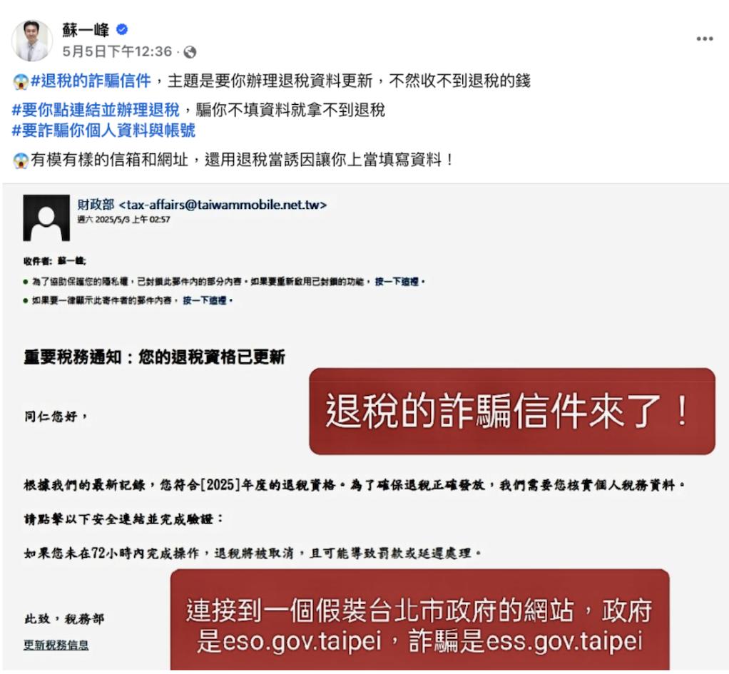 醫師蘇一峰分享,他收到一封來自「財政部稅務部」的 Email,內容指出他符合 2025 年退稅資格,並要求在 72 小時內點擊連結更新資料,否則將取消退稅甚至開罰。