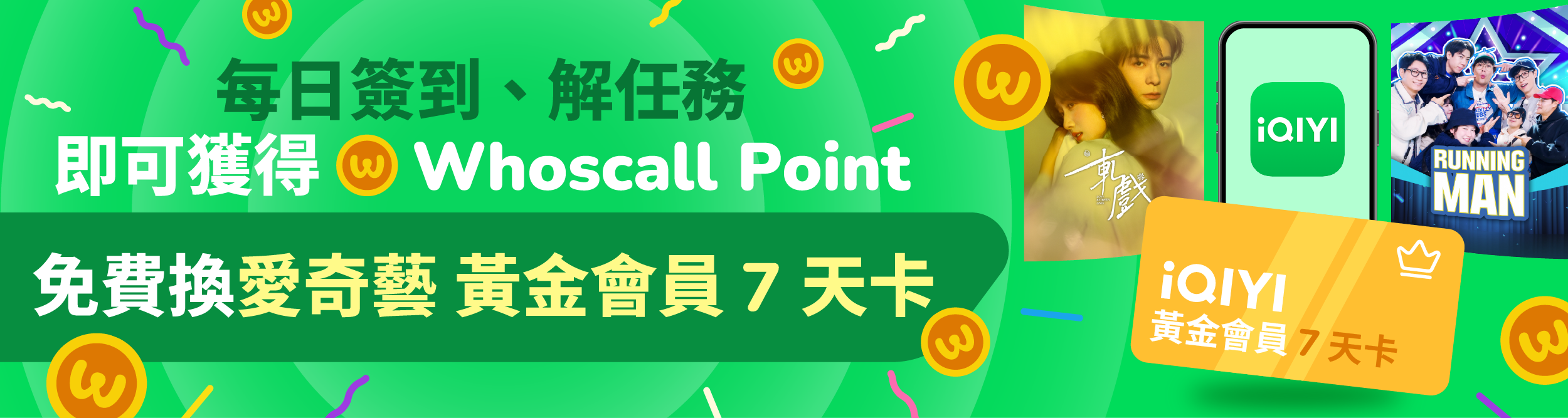 每天簽到 Whoscall,完成任務就能累積點數,免費兌換《愛奇藝》黃金會員 7 天卡。
