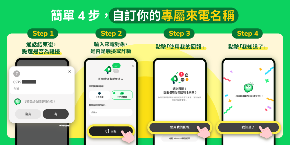 當您設定完成並點擊「使用我的回報」後,當該電話來電時,Whoscall 將優先以您的回報作為來電辨識結果。然而,這不代表您的回報將會成為全體用戶會看到的正式號碼名稱,唯有符合 Whoscall 演算法機制判定後,才有機會成為正式的號碼名稱。