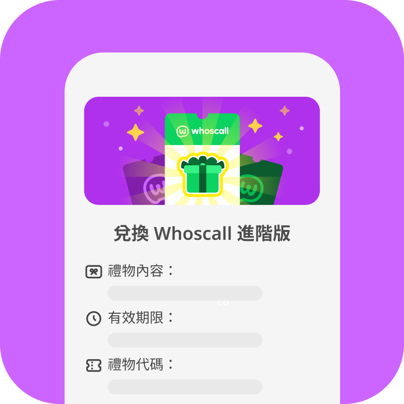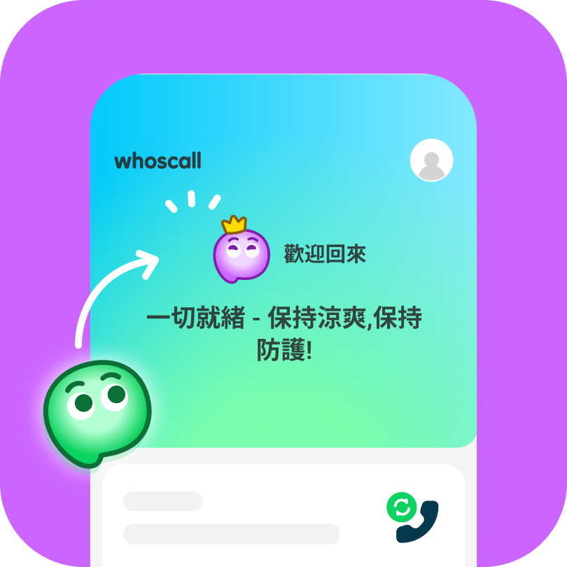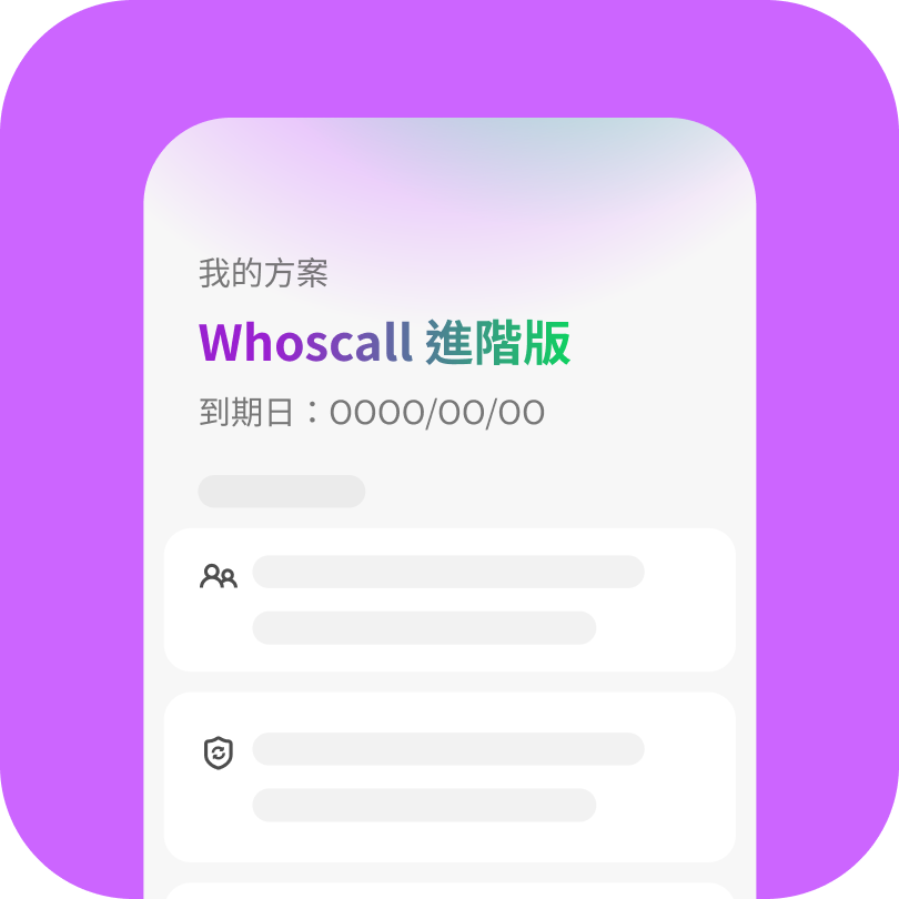 首頁:Whoscall Vee 會變成紫色,代表進階版已成功啟用!