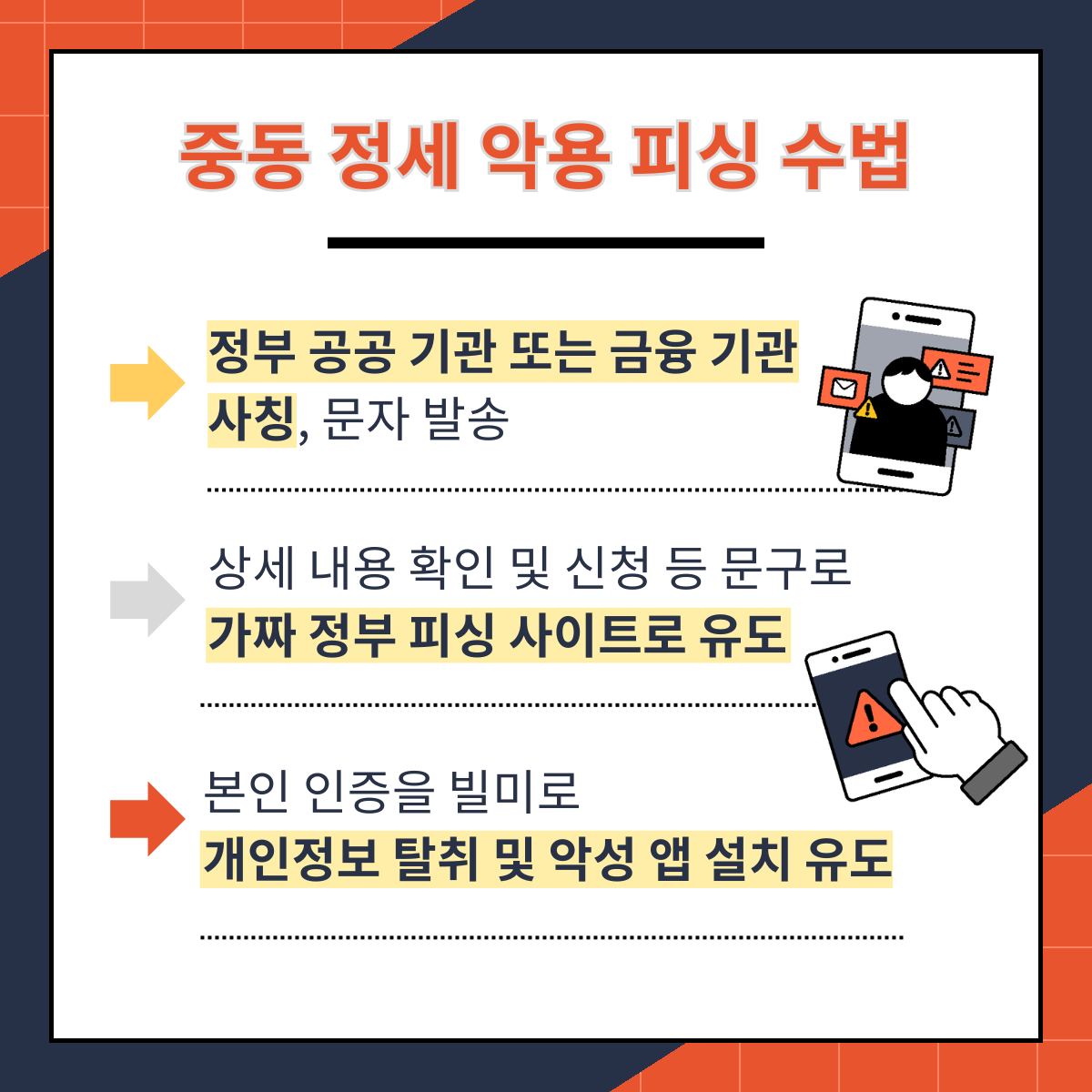 이번 스미싱의 특징은 현재 시의성 있는 이슈인 '중동 정세'와 '고유가'를 교묘하게 이용한다는 점입니다. 피싱 사기꾼들은 다음과 같은 3단계로 우리의 소중한 자산을 노립니다.